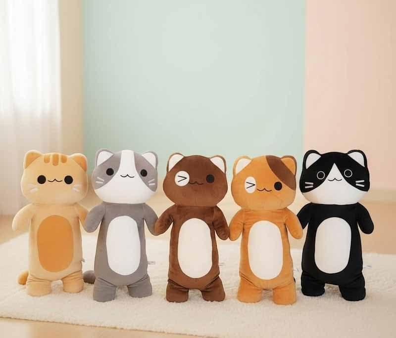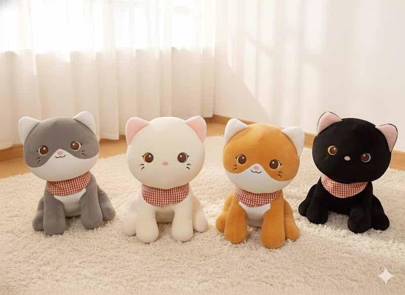 Various types of cat stuffed animals in different type of textile or fabric and size.