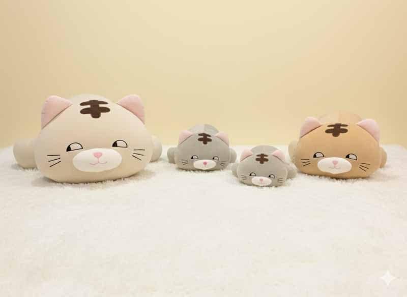 Various types of cat stuffed animals in different type of textile or fabric and size.